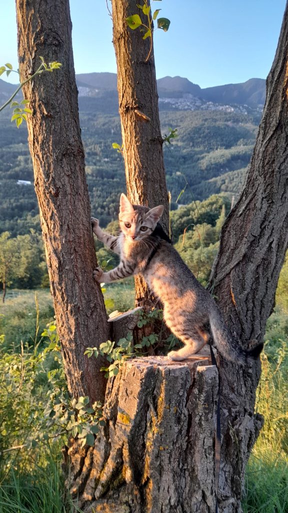 Gató mascle, d’uns 4 mesos d’edat, recollit a Saldes. Fins ara ha estat d’acollida i ens expliquen que li encanta sortir a passejar, enfilar-se als arbres (com a bon felí) i jugar amb els altres.